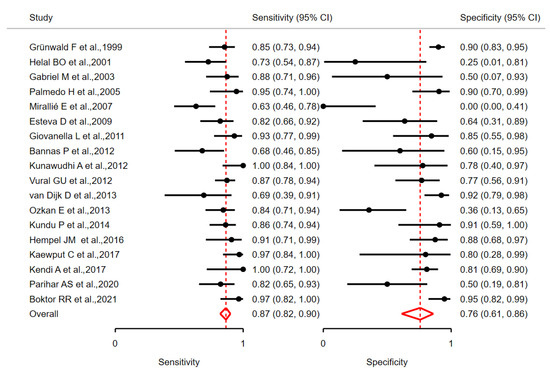 Estimated per-patient pooled sensitivity and specificity of [18F]FDG PET/CT in the detection of dedifferentiated thyroid cancer lesions in patients with TENIS syndrome, in studies included in the meta-analysis [23,25,26,27,28,29,30,31,32,33,34,35,36,38,40,41,42,44].