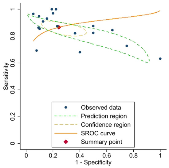 SROC curve of the performance of [18F]FDG PET/CT in the detection of dedifferentiated thyroid cancer lesions in patients with TENIS syndrome.