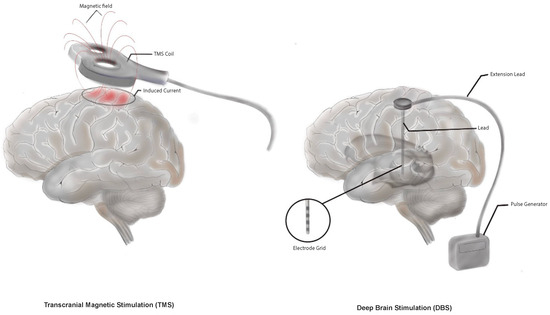 Depiction of Transcranial Magnetic Stimulation (TMS) and Deep Brain Stimulation (DBS) as treatments for central post-stroke pain (CPSP). TMS delivers non-invasive magnetic pulses to the brain’s cortical regions involved in pain control, while DBS involves surgically implanted electrodes that target deep brain structures to alleviate chronic pain. Both approaches aim to regulate abnormal neural activity contributing to CPSP symptoms.