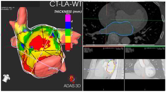 The CE-CT data acquired before the procedure were exported in a compatible format to facilitate further analysis using the artificial intelligence-based automatic detection of arrhythmic substrate (ADAS) software (version 2.12.1) (Galgo Medical SL, Barcelona, Spain). The ADAS 3D™ software was used to study MDCT images, allowing for the generation of a three-dimensional map representing the AWT. The AWT calculation was conducted in two stages. Initially, the software delineated the endocardial layer using pixel intensity thresholds and then segmented the endocardial and epicardial layers. Subsequently, manual delineation of the pulmonary veins, left atrial appendage, and mitral area was performed. To determine wall thickness, the artificial intelligence software computed the distance between each endocardial point and its corresponding projection onto the epicardial shell (Figure 1). This process resulted in a three-dimensional wall thickness map, which was subsequently divided into 1 mm intervals to facilitate operator-guided selection. On average, the image processing task was completed by a skilled operator within approximately 12 ± 2 min.