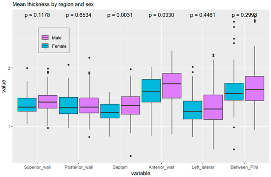 Figure 4 shows the thickness of the walls by anatomical region and sex, indicating a statistically significant difference between sexes in the septal and anterior walls (p = 0.03 for the anterior wall, p = 0.003 for the septal wall).