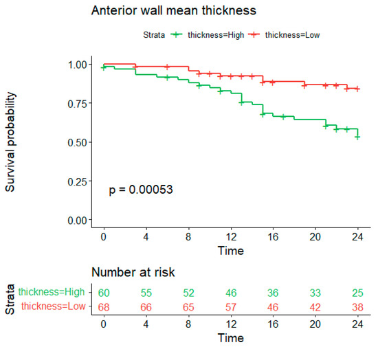 The relationship between mean anterior wall thickness and recurrence-free survival over a 24-month follow-up period was analysed using the Kaplan–Meier method. Patients were divided into ‘high’ (>1.69 mm) and ‘low’ (≤1.69 mm) thickness groups based on an optimal cut point of 1.69 mm. The log-rank test indicated a statistically significant difference in survival probabilities between the two groups (p = 0.00053), with the high-thickness group demonstrating a lower survival probability throughout the study duration (Figure 8). Discriminant analysis identified the thickness of the anterior wall (optimal cut-off point of 1.69 mm, p = 0.00053) and LAVi as the strongest predictors of arrhythmic recurrence. At the start of the follow-up, the number of patients at risk in the ‘high’ thickness group was 60, and in the ‘low’ thickness group, it was 68. By the end of the study, these numbers had decreased to 25 and 38, respectively.