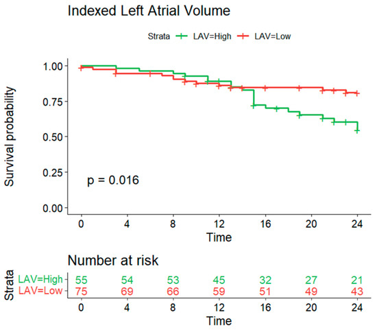 The Kaplan–Meier method was also used to evaluate the impact of the indexed left atrial volume (LAV) on recurrence-free survival over a 12-month follow-up period. Patients were stratified into ‘high’ (>51.163) and ‘low’ (≤51.163) LAV groups. The log-rank test revealed a statistically significant difference in survival probability between these groups (p = 0.016) (Figure 9). Initially, there were 79 patients in the ‘high’ LAV group and 51 in the ‘low’ LAV group. By the end of the study, the number of at-risk patients had decreased to 68 and 36, respectively.