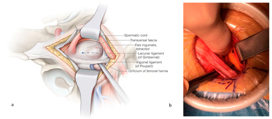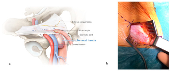 - Waltz, P.; Luciano, J.; Peitzman, A.; Zuckerbraun, B.S. Femoral Hernias in Patients Undergoing Total Extraperitoneal Laparoscopic Hernia Repair: Including Routine Evaluation of the Femoral Canal in Approaches to Inguinal Hernia Repair. JAMA Surg. 2016, 151, 292–293. [Google Scholar] [CrossRef] [PubMed]