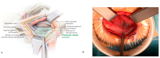(a) The femoral mesh is placed over Cooper’s ligament and folded over it mainly dorsally and a bit caudally. The remaining mesh covers the femoral orifice with an equal overlay medially over the insertion of the pectineal ligament and laterally over the femoral vessels. (b) Ventrally, the mesh is approaching the incisional border of the external oblique fascia. ©spMedical-illustration—produced for JDG.