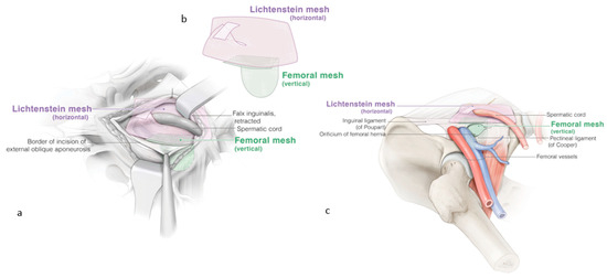 (a) Reinforcement of the inguinal region with a classic Lichtenstein repair, the pink mesh. The femoral extension of the Lichtenstein technique with the secondary green mesh for the femoral hernia. (b) The self-gripping prosthesis for the femoral mesh is cut to size: 7 cm from ventral to dorsal and 4.5 cm from medial to lateral. (c) The final result with both meshes, preferably with an overlap of approximately one centimeter. ©spMedical-illustration—produced for JDG.