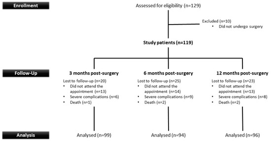 Overall characteristics of the patients included in the study. A total of 10 of the 129 patients identified during the preoperative period were excluded as they were in the end not subjected to the surgical procedure. Some patients were lost to follow-up as they did not show up for their follow-up visits, presented with severe complications, or passed away. However, two patients who missed their 6-month follow-up did attend the final follow-up visit.