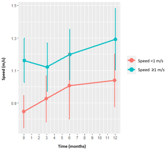 All statistical analyses were carried out using the IBM SPSS Statistics for Windows software package (IBM Corp., 2017, Version 25.0, Armonk, NY, USA). A descriptive statistical analysis was performed of all the data collected. The progression of all kinematic gait parameters and of the patients’ scores on the knee function and QoL scales was evaluated at the different follow-up consultations. Patients were classified into two groups according to whether their baseline velocity was < or ≥1 m/s. The progression of velocity over time was analyzed in both groups as well as the patients’ baseline and postoperative knee function and QoL scores and their progression over time. The Shapiro–Wilk test was used to determine the normality of the subsets, and Student’s two-tailed paired test and a chi-squared test were used to confirm or refute the hypotheses generated. Pearson’s correlation coefficient was used to evaluate the correlation of the baseline kinematic gait parameters with the different function and QoL subscales at 12 months postoperatively. Hinkle et al.’s range-based classification system was employed to determine correlations based on Pearson’s coefficient [22]. Statistical significance was set at a value of p < 0.05 in all cases.