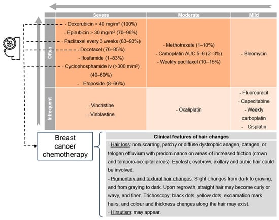 Over the past several decades, early detection and advances in breast cancer therapies have revolutionized its management. Despite the promising survival rates, novel systemic anti-cancer therapies have also introduced a variety of dermatological toxicities, significantly increasing the number of patients living with these sequelae [1]. The most commonly used agents for breast cancer generally target rapidly dividing cells and are therefore associated with a myriad of mucocutaneous toxicities that affect hair, skin, nails, and mucosal surfaces due to their high turnover rate of epithelial cells. The most commonly encountered chemotherapy-induced dermatological toxicities include alopecia, hand–foot syndrome, mucositis, and nail changes, where alopecia consistently ranks among the most traumatic and troublesome aspects and can lead to functional impairment and physical and emotional distress. Between 40% and 100% of breast cancer patients experience complete alopecia after cytotoxic chemotherapy [2]. The state of a person’s scalp is regarded as a gender-identity marker and provides psychosocial signals that range from general well-being to social status across most cultures globally. Although hair regrows after chemotherapy, over 40% of patients still experience permanent partial alopecia three years later [2].