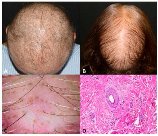 Persistent chemotherapy-induced alopecia in breast cancer survivors: (A) diffuse alopecia 2 years after taxane-based chemotherapy completion; (B) persistent chemotherapy-induced alopecia 1.6 years after taxane-based chemotherapy completion with similar pattern of androgenetic alopecia and predominant hair thinning on the crown area; (C) trichoscopy of patient in (B) with miniaturized hairs, showing hair thinning and yellow dots. (D) Histology section showing fibrosis and mild perifollicular inflammation (hematoxylin–eosin stain) [9].