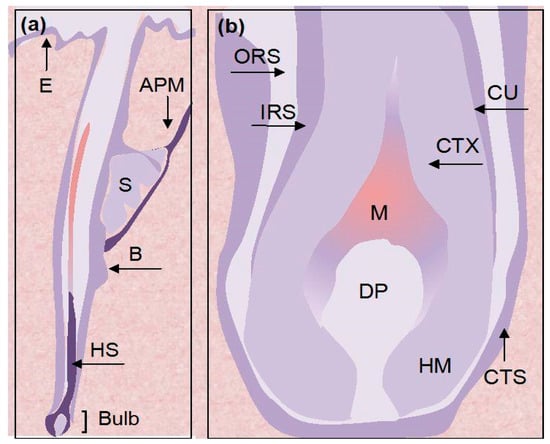 Schematic representation of structure of hair follicle in its mature anagen phase: (a) a full-length longitudinal view of hair follicle; (b) hair follicle bulb. Abbreviations: APM, arector pili muscle; B, bulge; CTS, connective tissue sheath; CTX, cortex of hair shaft; CU, cuticle of hair shaft; DP, dermal papilla; E, epidermis; HM, hair matrix; HS, hair shaft; IRS, inner root sheath; M, melanocytes; ORS, outer root sheath; S, sebaceous gland [12].