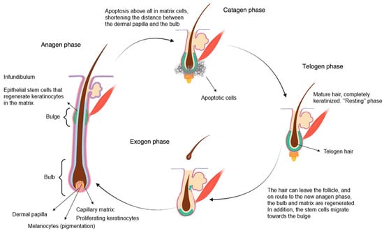 Once formed, the hair follicles undergo life cycles unique to the hair follicle and not observed in any other mammalian structure. These continuous rhythmic changes driven by apoptotic signals are characterized by stages of rapid growth and elongation of the hair shaft that alternate with periods of quiescence and regression. Figure 4 depicts phases of the normal cycle of hair growth that can be divided into the following three phases: anagen, catagen, and telogen, after which shedding, or exogen, occurs. Between 80% and 90% of hairs are in the anagen phase, which lasts for a period of 2–6 years during which mitotically active cells of the matrix found in the hair bulb differentiate and divide, resulting in the actual production of hair fiber. Next is catagen, the transition phase, where growth stops, and the follicle undergoes apoptosis-driven regression. After that, the hair enters the telogen phase, also known as the resting phase, when all mitotic activity stops, and the fully keratinized hair is ready to be shed. Although the exact mechanism that controls phase progress is not fully explored, the bulge activation theory postulates that the growth-phase transitions eventuate when the bulge stem cells are activated by growth factors produced in the dermal papilla. The transient amplifying nature of these cells allows them to only go through a limited number of mitoses, which sets the duration of anagen and the onset of catagen phases.