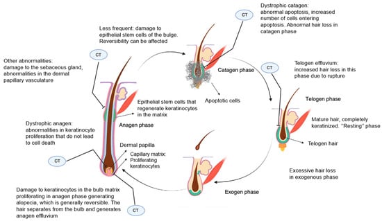 Main sites where chemotherapy affects the hair cycle and generates alopecia. CT, chemotherapy [13].