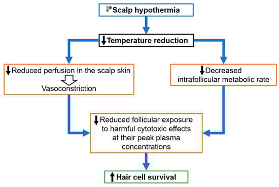 In scalps exposed to chemotherapy, delivery of scalp hypothermia is theorized to act by causing vasoconstriction of blood vessels, reducing the amount of cytostatic and cytotoxic agents reaching the scalp, decreasing the intrafollicular metabolic rate, and follicular drug uptake and overall resulting in reduced follicular exposure to harmful cytotoxic effects at their peak plasma concentrations, as shown in Figure 8 [16]. Furthermore, induced cell cycle arrest at the G0/G1 phase, increased HSP70 accumulation for cell stress protection, and reduced cell apoptosis have also been proposed as potential mechanisms of protection against chemotherapy-induced alopecia [8].