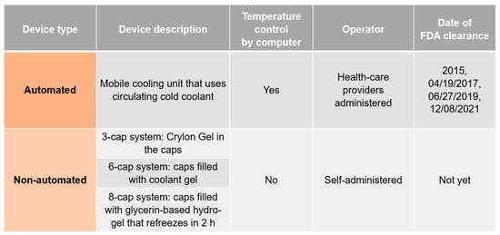 Presently, two types of scalp cooling devices for patients with solid tumours undergoing chemotherapy regimens are available: automated and non-automated. Figure 9 and Figure 10 summarize the current evidence and current clinical trials on both FDA-cleared scalp cooling systems and self-administered cold caps, not cleared by the FDA, that are also available from several manufacturers.