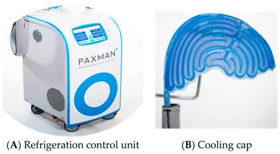 Automated scalp cooling system: a refrigeration unit (A) and a cooling cap (B) [25].