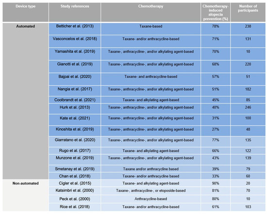 As the field continues to expand and evolve, the last few years have witnessed a growth in supportive studies with promising results on scalp hypothermia in breast cancer survivors. Evidently, the effectiveness of scalp hypothermia for hair preservation depends on the device, with variable degrees and durations of cooling, chemotherapy agent and regimen, patient performance status, intrinsic patient characteristics, metabolism, hair thickness, head shape, and cap fitting [26]. Figure 12 summarizes the majority of the most recent studies. In one of the most recent meta-analyses encompassing 2179 chemotherapy patients, 60.7% experienced <50% hair loss. In 28 studies focused on taxane-based chemotherapy, the rate was 60.0%. Hair loss was significantly lower with scalp hypothermia (49.3%) compared to no treatment (0%). Scalp cooling resulted in less than 50% hair loss in paclitaxel- and docetaxel-based treatments. Patient satisfaction with scalp cooling was 78.9% [27].