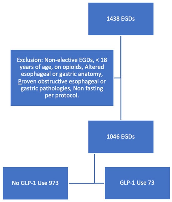 Study Population and Data Collection: The study was approved by the institutional review board (IRB) at AdventHealth (Orlando, FL, USA). The electronic endoscopy database (Provation, Minneapolis, MN, USA) was retrospectively queried for elective EGD procedures from 1 January to 30 June 2023, at the outpatient endoscopy center at AdventHealth, Orlando, FL, USA. Exclusions included non-elective procedures, patients under 18, opioid therapy, altered gastric anatomy, known gastroparesis, or obstructive pathologies. All patients followed institutional fasting protocols before the procedure, which included a minimum of 4 h for clear liquids and 6 h for solids. Baseline data included patient demographics, co-morbidities, GLP-1 use, or other medications affecting motility. Procedural data extracted from the endoscopy reports included ASA class, type of procedure, type of anesthesia, presence of food in the stomach, and procedure-related complications.