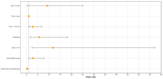 Statistical Analysis: Univariate logistic regression analyses were performed to assess the individual association between each covariate and the outcome variable of food retention, allowing us to identify variables that have a statistically significant association with the outcome variable at a predetermined significance level (p < 0.10). The Hosmer–Lemshow test p value is 0.3285, indicating a good model fit. Though the McFadden R2 value of our model does not reach 0.4, which is considered an exceptionally good fit, a value of 0.273 still suggests that the model has a reasonably good level of explanatory power. Variables that have a statistically significant association in the univariate analyses were included in the multivariate logistic regression model. Stepwise elimination was then employed to select the final predictor variables. The final multivariate logistic regression model included variables that remained statistically significant (p < 0.05) or demonstrated a meaningful impact on the outcome variable after adjusting for other covariates. Patients were divided into two groups: those using GLP-1 agonists and a control group not using these medications. Continuous variables were compared using the t-test or Wilcoxon rank sum test. Categorical variables were compared using the Chi-square or Fisher’s exact test.