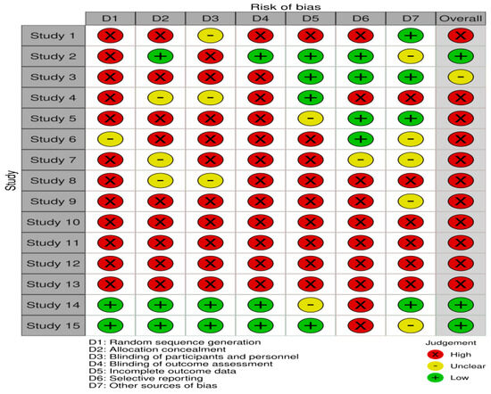 This systematic review adheres to the Preferred Reporting Items for Systematic Reviews and Meta-Analyses (PRISMA) guidelines [15]. A review protocol was prepared before the study began and was applied throughout the study. A comprehensive literature search of Medline, PubMed, Web of Science, Embase, Scopus, and Scholars databases was performed until March 2024, identifying all studies relevant to the question of interest. The search strategy employed a comprehensive set of keywords to identify relevant studies using IMIDs in hereditary hemorrhagic telangiectasia (HHT). Keywords included ‘thalidomide’, ‘lenalidomide’, ‘pomalidomide’, ‘immunomodulatory drugs’, and ‘HHT’. A literature search was conducted by two writers who independently examined the entire texts of eligible studies to determine if they matched the inclusion criteria. Any discrepancies were settled by discussion amongst the authors, with the involvement of the senior author if necessary for the decision-making process. The Robvis assessment tool (visualization tool for risk of bias assessments in a systematic review) was used to evaluate the risk of bias (Figure 1). This review has not been registered in any publicly accessible database