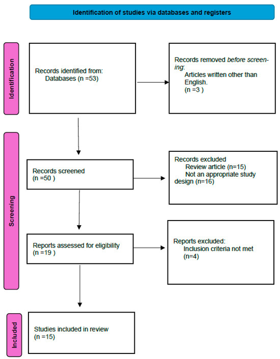 For this systematic review, 53 publications were screened and 15 publications that met the inclusion criteria were included (Figure 2). It has been observed that thalidomide has been more widely researched as a treatment for HHT. Of the 15 studies included in this review, 12 were thalidomide studies. These studies are summarized in Table 1.