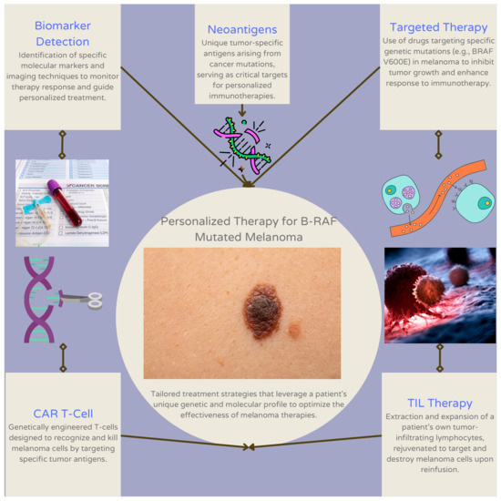 This figure outlines personalized therapy pathways in BRAF-mutant melanoma. Key components include biomarker detection for identifying specific molecular markers and monitoring therapy response, and neoantigens, which are unique tumor-specific antigens that serve as critical targets for personalized immunotherapies. Targeted therapy focuses on inhibiting tumor growth by targeting specific genetic mutations (e.g., BRAF V600E) to enhance immunotherapy response. CAR T-cell therapy involves genetically engineered T-cells designed to recognize and kill melanoma cells, while TIL therapy uses the extraction and expansion of a patient’s own tumor-infiltrating lymphocytes to target and destroy melanoma cells.