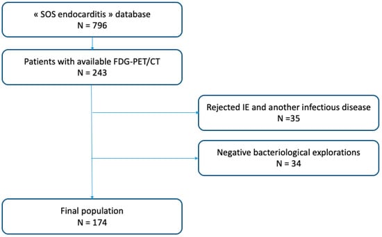 - Hugues, B.; Emsen, B.; Pina Vegas, L.; Lepeule, R.; Ternacle, J.; Huguet, R.; Decousser, J.W.; Fiore, A.; Lim, P.; Itti, E.; et al. PET/CT for osteoarticular septic grafts in endocarditis: A large monocentric cohort. Jt. Bone Spine 2023, 90, 105577. [Google Scholar] [CrossRef] [PubMed]