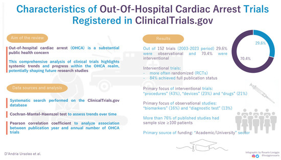 Background/Objective: Out-of-hospital cardiac arrest (OHCA) poses a substantial public health concern. A collective evaluation of clinical trials is crucial for understanding systemic trends and progress within a specific research area of interest, ultimately shaping future directions. We performed a comprehensive analysis of the characteristics of trials in the adult OHCA population registered on ClinicalTrials.gov. Methods: Aided by medical subject headings (MeSH), we systematically searched the ClinicalTrials.gov database. Trends over time were assessed with the Cochran–Mantel–Haenszel test. The association between publication year and annual number was assessed with the Pearson correlation coefficient. Results: Out of 152 trials spanning the 2003–2023 period, 29.6% were observational and 70.4% were interventional. Compared with the observational trials, interventional trials were more often randomized (RCT) and achieved full publication status in 84% of cases (p = 0.03). The primary focus of interventional trials was “procedures” (43%), “devices” (23%), and “drugs” (21%). Observational studies focused on “biomarkers” (16%) and “diagnostic test” (13%) (p < 0.001). A decrement in the number of interventional trials with a sample size ≥100 patients across three temporal study points was observed. Nevertheless, published studies predominantly had a sample size ≥100 patients (76%), in contrast to unpublished trials (p ≤ 0.001). An increase in the number of interventional studies funded by the “academic/university” sector was also recorded. Conclusions: Clinical trials on OHCA primarily involved interventions aimed at treatment and were more often randomized, single-center, with small (<100) sample sizes, and funded by the “academic/university” sector.