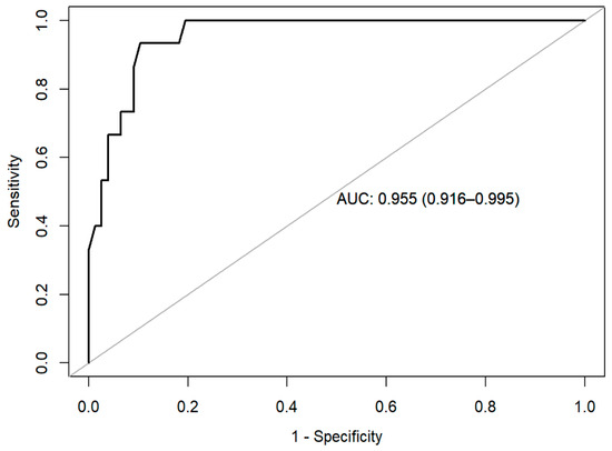 As shown in Table 3, the final model revealed a statistically significant association between presenting a mood disorder, the MADRS total scores, and the YMRS total scores (p < 0.001). The Hosmer–Lemeshow statistic was 6.398 (p = 0.603), suggesting a well-calibrated predictive model. These findings suggest that having a mood disorder is associated with greater levels of depressive symptoms and psychiatric disease severity. We further estimated the prediction efficacy of the model by performing an AUC analysis, showing a value of 0.965 (Figure 1). Altogether, these results indicate that the model can precisely detect the presence of a mood disorder in SLE patients.