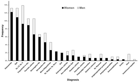 The frequency of different diagnoses was compared between sexes (Figure 1). The incidence of osteoarthritis was statistically significantly higher in women compared to men (chi-sq = 13.76; df 5; p = 0.017).