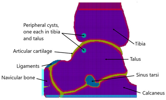 The picture resolution we used for this modeling was 250 × 250 pixels. The FEM modeling started from the assignment of 256 material attributes consisting of bitmap shades in the picture grayscale using the CT2FEM v1.0 software (Mrzyglod, Cracow University of Technology, Cracow, Poland). The bone cross-sectional surface was modeled using eight-node solid linear finite elements of 0.5 mm in size, grouped according to the individual material properties considered. The mesh was not optimized given the assumption of fast modeling. The model’s boundary conditions consisted of restraining at its base and loading with distributed force according to gravity at its top. The boundaries corresponded to the areas normally formed by healthy bone tissue, the articular cartilages of the talocrural, talocalcaneal, and talonavicular joints, ligaments, and small fluid spaces. Regarding the degenerative changes, fluid-filled cysts were considered. The cysts were superimposed on the bone contour scheme by hand in central and peripheral locations. Their size grossly averaged that of in vivo degenerative conditions [15].