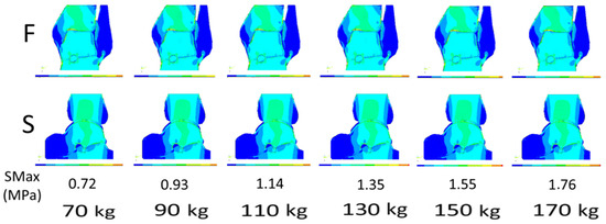 Strain distribution in the in silico 2D finite element modeling (FEM) in the ankle joint with increasing patient body weight. All illustrations present a normal joint without any diseased changes. A standard patient weighing 70 kg was taken as a reference for comparisons. Illustrations are in the frontal (F—upper row) and sagittal (S—lower row) planes; SMax, stress maximum.