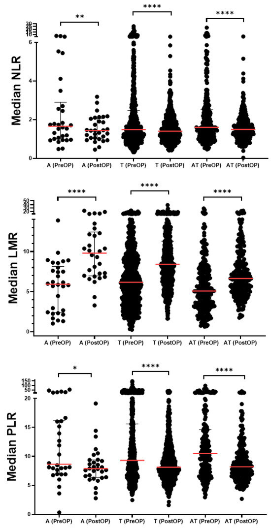 Moreover, the findings highlight the potential utility of NLR, LMR, and PLR as markers for monitoring surgical outcomes. Regular assessment of these markers could provide clinicians with valuable information about the patient’s inflammatory status, allowing for more personalized postoperative care. For instance, patients with persistently elevated NLR or PLR after surgery might benefit from closer monitoring or additional interventions to address ongoing inflammation.
