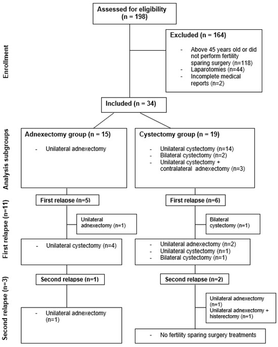 Finally, a total of 34 patients who met the inclusion criteria were included. Among them, 15 underwent adnexectomy and 19 underwent cystectomy. Within the cystectomy group, 14 patients underwent UC, 2 patients underwent BC, and 3 patients underwent UC + CA.