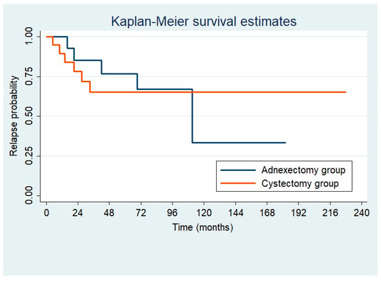 Progression-free survival rates after 36 months were 85% (95% CI 0.53–0.96) after adnexectomy and 66% (95% CI 0.39–0.83) after cystectomy. The corresponding 60-month free survival rates were 76% (95% CI 0.32–0.86) for adnexectomy and 66% (95% CI 0.39–0.83) for cystectomy. We did not find differences in the recurrence rate between the groups (cystectomy, 31.6% vs. adnexectomy, 33.3%; p = 0.996). Kaplan–Meier estimates of disease-free survival are shown in Figure 2.
