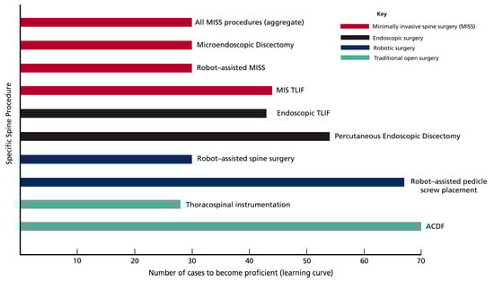 The learning curve associated with operative spinal procedures. For most MISS techniques, the learning curve to overcome operative times and complications is 20 to 30 cases []. Learning curves for specific MISS interventions range from 20 to 44 cases for MIS-TLIF [,,] and 25–30 for microendoscopic discectomy [,]. For endoscopic procedures, they range from 34 to 41 cases for endoscopic TLIF [,] and 18 to 54 cases for percutaneous endoscopic discectomy [,]. Robot-assisted spine surgeries require a learning curve of 14 to 30 cases overall for robot-assisted spine surgery [,,] and 13 to 67 cases for robot-assisted screw placement [,,,,]. For open spinal procedures, learning curves of 28 cases for thoracospinal instrumentation [] and 70 cases for ACDF [] are reported.