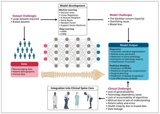 Artificial intelligence (AI) systems, particularly those utilizing machine learning (ML) and neural networks, have been increasingly integrated into spine surgery with the aim of enhancing patient outcomes, predicting surgical site infections, and improving the accuracy of surgical interventions [,,]. Despite its potential, the application of AI in spine surgery is fraught with limitations and ethical challenges that necessitate careful consideration (Figure 2). The application of AI to spine surgery requires substantial patient datasets, which are heavily relied upon by ML systems, such as artificial neural networks (ANNs), logistic regression (LR), random forest decision trees (RF), and support vector machines (SVMs) to provide accurate predictions []. However, SVMs struggle with datasets where the number of observations significantly exceeds the features, and their efficiency is reduced with very large datasets due to increased noise and outliers []. The development of truly generalizable applications for spine surgery is also severely hindered by the limited availability of large datasets dedicated to neuroimaging, which are important for covering the characteristics of spinal pathologies [].