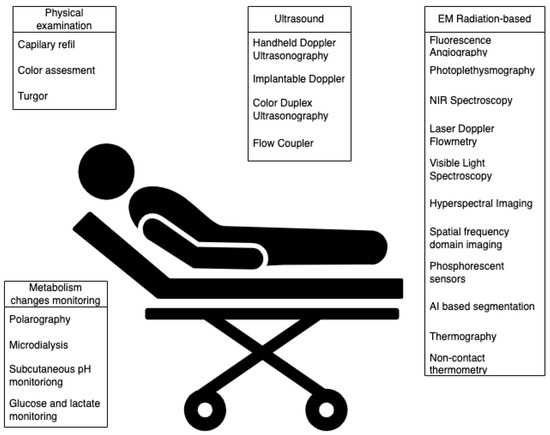 Even though, in recent years, autologous flaps have become an inseparable part of reconstructive plastic surgery, the risk of flap failure is still not negligible. Studies report success rates around 95% [1], which seems high, but we have to bear in mind that microvascular failure is a costly disaster and cannot be repeated indefinitely. Despite the significant progress in the development of monitoring techniques, major and minor complications, leading to the loss of the flap, still occur. In microsurgery and plastic surgery, it is crucial to recognize complications as soon as possible, which should enable the timely detection of micro-vascular failure and help ensure higher success rates of flap reconstructions. Despite numerous reviews describing postoperative flap monitoring techniques, no studies compare experimental and clinical methods from both a technical standpoint and clinical usefulness. Monitoring techniques were compared from a surgeon’s perspective (user of the monitoring system) and an engineer’s perspective (designer of the monitoring system). This thorough review discusses the multiple levels and aspects of state-of-the-art flap vitality monitoring systems and experimental solutions. As shown in Figure 1, we have assigned the methods to the following categories: physical examination, surface temperature measurement, ultrasound metabolism changes monitoring and light-based. In this article, we review all the methods presented. Furthermore, we presented accompanying challenges. In the first section of the review, we summarize fundamental flap classification based on movement mechanism, tissue type, and vascular supply. An angiosome concept delineating the safe clinical territory of flaps and perforasome theory were described. The most common postoperative complications were identified, analyzed, and presented. This knowledge is extremely useful in understanding the complex issue of monitoring tissue vitality.