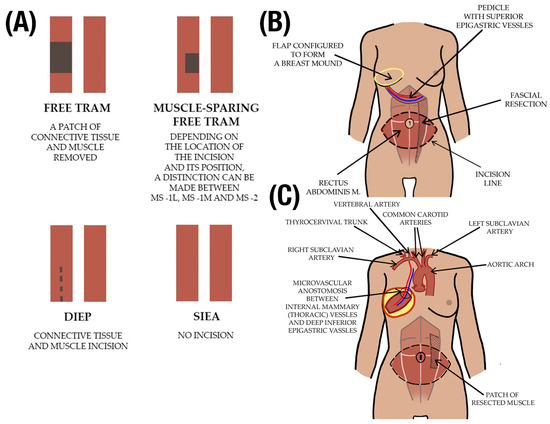 (A) A summary of free flap reconstruction methods comparing them by the amount of muscle involved is presented. Red blocks show an illustrative model of the transverse rectus abdominis muscle. Dark color represents amount of muscle removed (Free TRAM or MS-TRAM) or incised (in DIEP). (B) An example of pedicled flap: pedicled TRAM method employed in breast reconstruction surgery (C) An example of free flap: free TRAM method of breast reconstruction surgery.