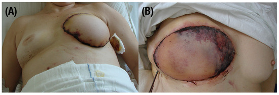 Complications after TRAM breast reconstruction. (A) Marginal ischemic necrosis. (B) Severe ischemic necrosis caused by vessel thrombosis.