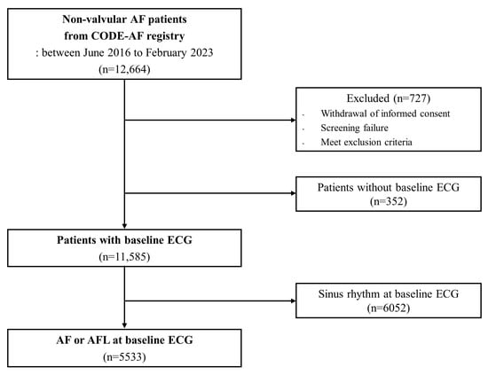 A total of 12,664 patients with non-valvular AF were enrolled between June 2016 and February 2023 (Figure 1). Among them, 727 were excluded due to (i) withdrawal of informed consent, (ii) screening failure, or (iii) meeting the exclusion criteria. Patients without baseline ECG (n = 352) and those with sinus rhythm on baseline ECG (n = 6052) were excluded; analyses were conducted on 5533 patients with AF or atrial flutter at baseline ECG.