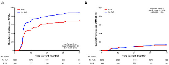 Time-to-event curves for primary and secondary endpoints. Figure above shows time-to-event curves for primary endpoint (recurrence of AF during follow-up) in the total cohort (a) and secondary endpoint (MACE) in the total cohort (b). RVR, rapid ventricular response; AF, atrial fibrillation; MACE, major adverse cardiovascular event; CI, confidence interval.