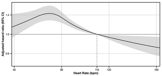 Adjusted hazard ratio according to heart rate. The adjusted hazard ratios and 95% confidence intervals according to heart rate were described using a cubic spline curve. Heart rate at 110 bpm was set as the reference for the adjusted hazard ratio. CI, confidence interval.
