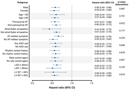 Subgroup analysis. Patients without rapid ventricular response were set as the reference in each group. CI, confidence interval; AF, atrial fibrillation; AAD, antiarrhythmic drug; LAD, left atrial diameter; LV EF, left ventricular ejection fraction.