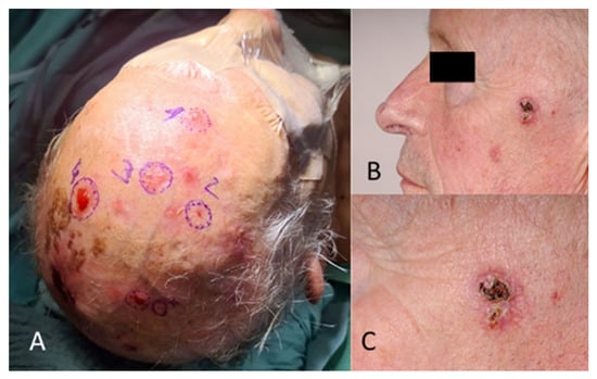 - Peris, K.; Fargnoli, M.C.; Garbe, C.; Kaufmann, R.; Bastholt, L.; Seguin, N.B.; Bataille, V.; Del Marmol, V.; Dummer, R.; Harwood, C.A.; et al. Diagnosis and treatment of basal cell carcinoma: European consensus-based interdisciplinary guidelines. Eur. J. Cancer 2019, 118, 10–34. [Google Scholar] [CrossRef] [PubMed]