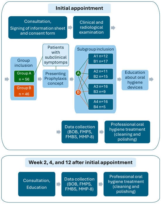 The study was conducted on 102 patients, 38/64 male/female (m/f). The number of patients in the subgroups was in the following order: A1: 12 (4/8 m/f); A2: 11 (3/8 m/f); A3: 17 (5/12 m/f); A4: 16 (9/7 m/f); B1: 17 (5/12 m/f); B2: 15 (7/8 m/f), B3: 9 (4/5 m/f); and B4: 5 (1/4 m/f). Twenty-one patients in group A were older than 40 years, and 35 were younger. Of the 46 patients in group B, 42 patients were older than 40 years. A detailed table of ages is provided in the Supplementary Materials. During the first examination, study team members and dentists, educated patients on how to optimize the use of devices according to their oral hygiene habits, and introduced them to the Prophylaxis Concept. Patients returned 2, 4, and 12 weeks after the first visit for reassessment, and professional oral hygiene treatment. MMP-8, BOB, FMPS, and FMBS values were recorded at each visit. There were no dropouts among the 102 patients.