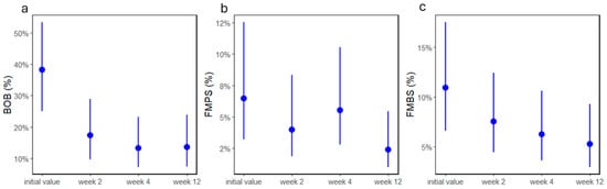 (a) BOB, (b) FMPS, and (c) FMBS values as percentages of patients with subclinical symptoms before and 2, 4, and 12 weeks after treatment. Dots and lines represent estimated means ± standard deviations.