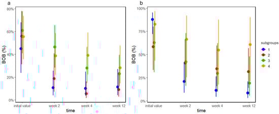 BOB values significantly decreased in both groups in our study (both p < 0.0001), and the time and subgroup interaction also had a significant effect on BOB values (both p < 0.009; Figure 3a). This interaction was reflected in a large decrease in subgroups A1 and A2 after two weeks, whereas in subgroups A3 and A4, the decrease was less substantial, and BOB values were higher at week 4 in A3 and A4 than in A1 and A2. Results similar to those of group A (Figure 3b) were obtained in group B, the only difference being that BOB values in subgroup B4 did not change at all during our study.