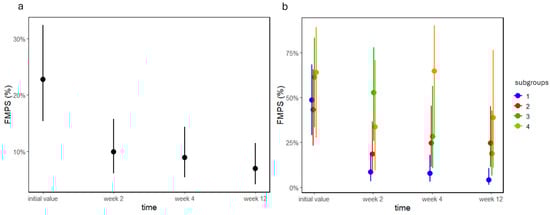 FMPS values as percentages of groups (a) A and (b) B before and 2, 4, and 12 weeks after treatment. Dots and lines represent estimated means ± standard deviations.