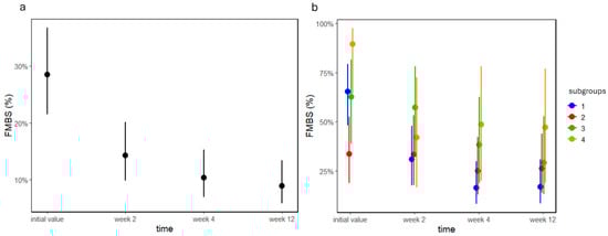 FMBS values as percentages of groups (a) A and (b) B before and 2, 4, and 12 weeks after treatment. Dots and lines represent estimated means ± standard deviations.